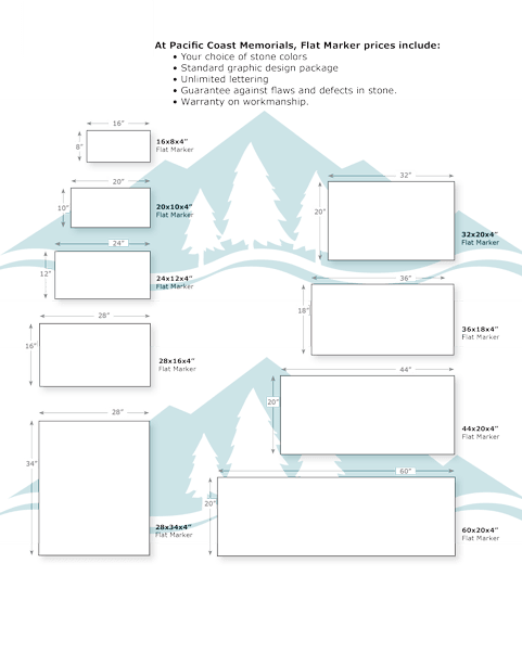At Pacific Coast Memorials our standard Flat Grave Markers are 4" thick and come in your choice of Granite Colors. If you don’t see a specific size you are looking for, let us know and we can cut a marker to any size you need. We produce some of the finest affordable Grave Markers and headstones for graves among monument companies; view our online Flat Marker Portfolio for examples of our work.